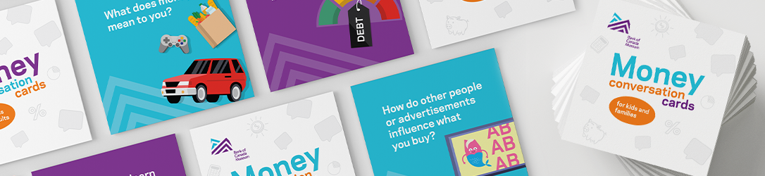 Start a conversation about money and finances with our question cards. Choose between two card decks: one for kids and their families and one for adults and teens.