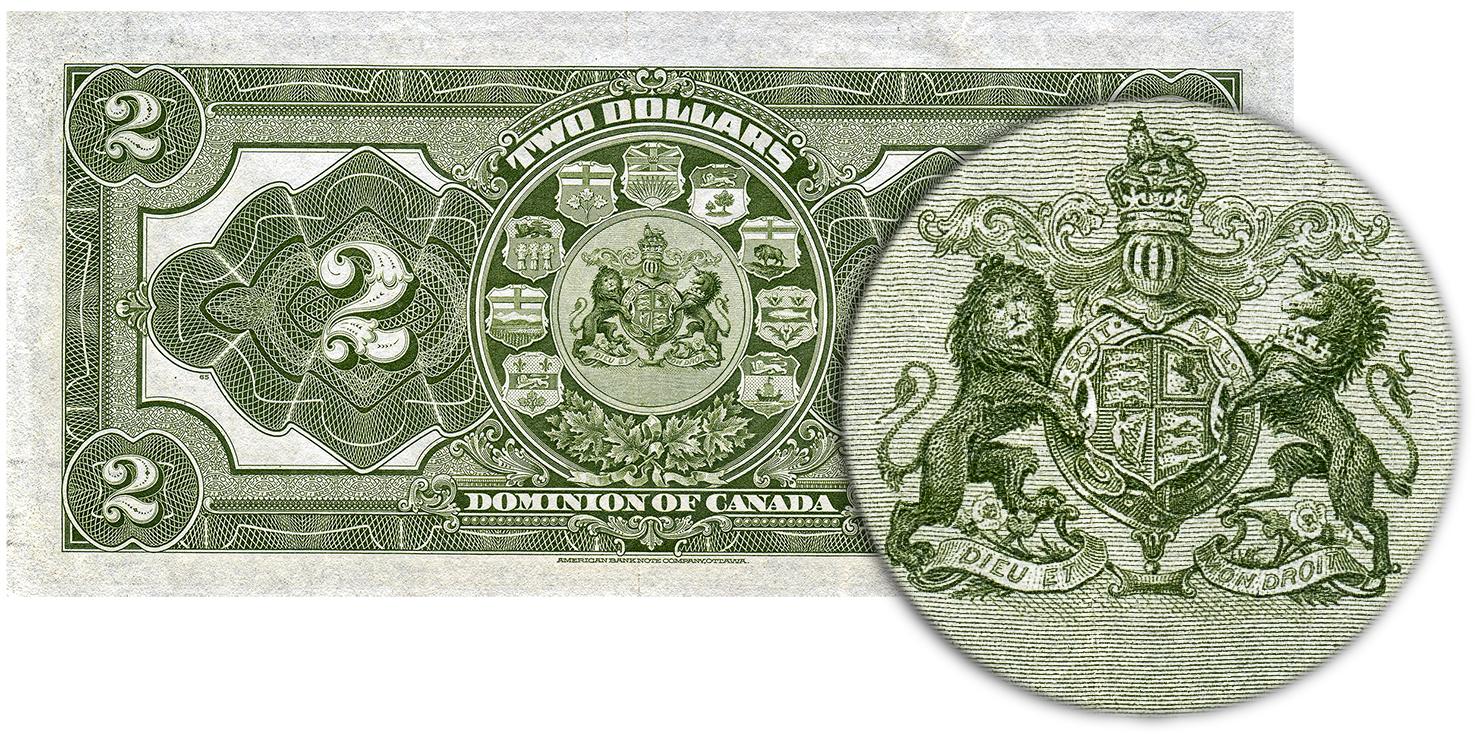 This is the first use of what appears to be a coat of arms on a Canadian government bank note—but at that time there was no Canadian coat of arms. The Coat of Arms of Canada was first printed on the 1954 series of notes and every note through the Canadian Journey series. It has since reappeared on the Vertical 10.