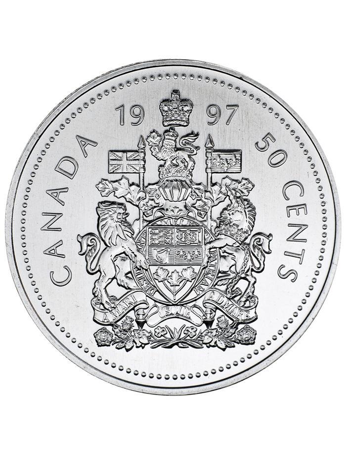 Since 1937, the only real changes that have occurred to the tails sides of our coins are the dates. For many years, only the first three numbers of the dates were on the master coin dies, and the final numbers were added to the production die by hand. This resulted in a few unplanned variations that take a pretty sharp and educated eye to spot. For the vast majority of us, the designs introduced in the late 1930s—the maple leaves, beavers, schooners and caribous—appeared unchanged every year on our regular issued coins. But the 50-cent piece is a different story, because every time our coat of arms changed, so did the coin.